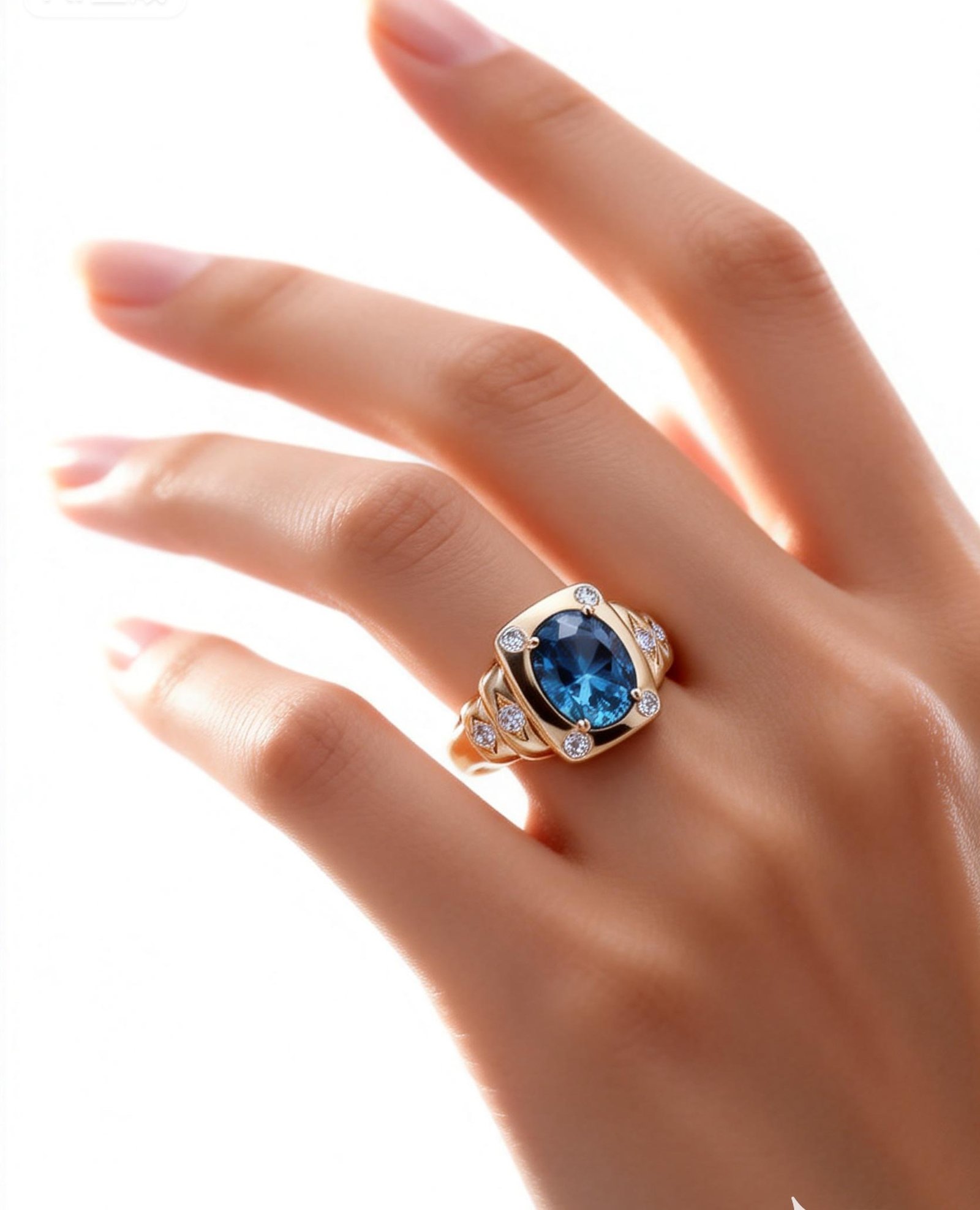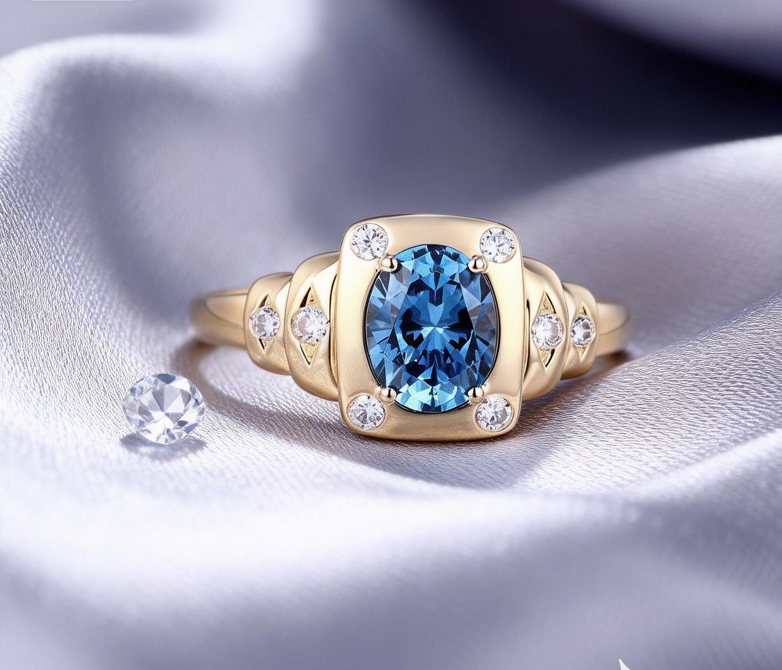 Swiss blue Topaz Oval shape ring with Lab grown diamond accent in 925 silver with 14K yellow gold plating